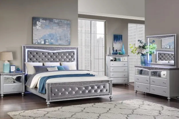 MIRRORED GREY VELVET LED BEDROOM