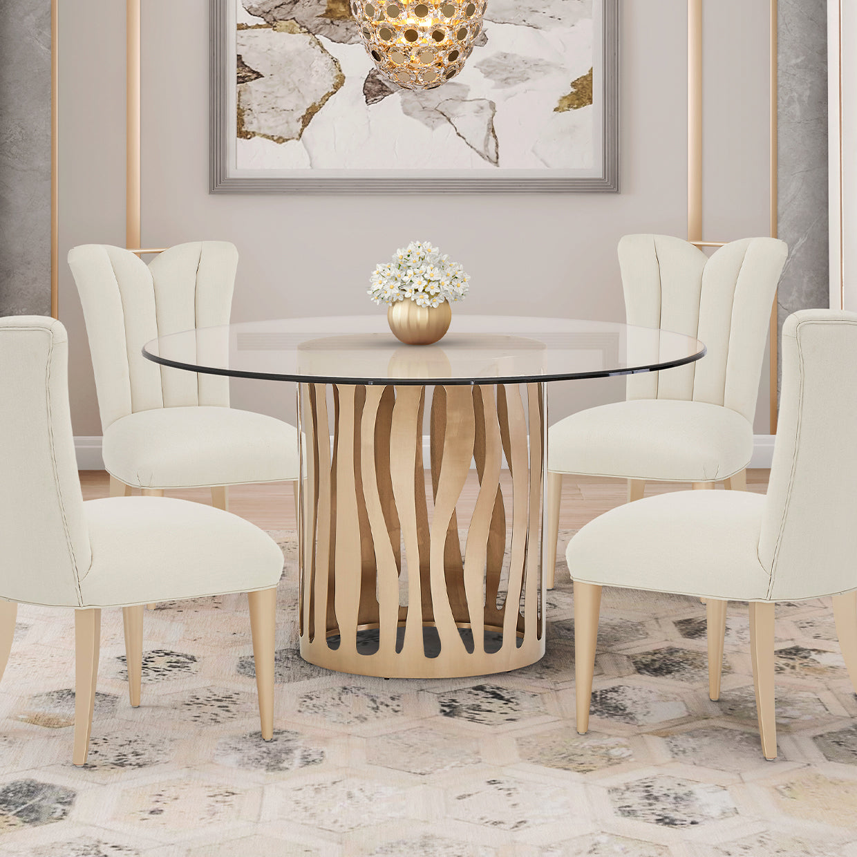 Snap a shot of chicness! This La Rachelle Dining Table stands out with its sophisticated metal base and shiny glass top. It's perfect for fancy nights or everyday meals. No matter what, you'll feel effortlessly stylish.